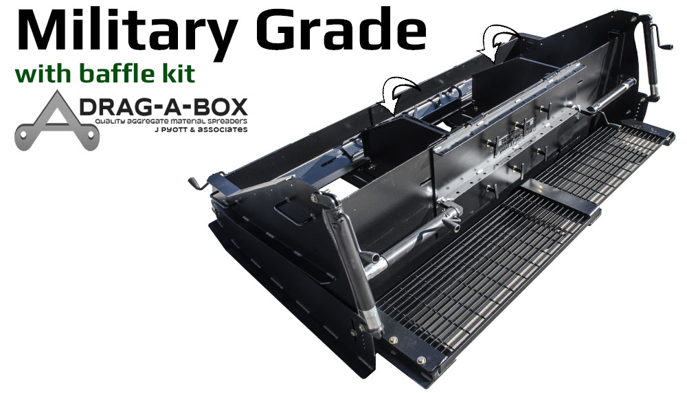 An optional version of the Military Grade Spreader is the Military Grade Material Spreader with Baffle Kit. This version has a different structural center tray with additional pull bar mounts and comes with a single Baffle Kit. The Baffle Kit consists of one drivers side Divider Assembly and one passengers side Divider Assembly. Additional Baffle Kits can be purchased separately.